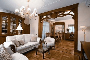 - Основной материал, который используется при разработке интерьеров, является древесина. Дизайн квартиры в стиле модерн полон деревянной мебели, отделки и декоративных элементов. Натуральное дерево, как правило, имеет высокую стоимость. Возможно, понадобится приобретать дорогостоящую деревянную мебель или изготавливать ее на заказ. Но результат однозначно того стоит!